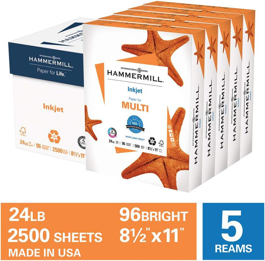 Hammermill Printer Paper, Multipurpose Inkjet Paper 24 lb, 8.5 x 11 - 5 Ream (2,500 Sheets) - 96 Bright, Made in the USA, 105050C