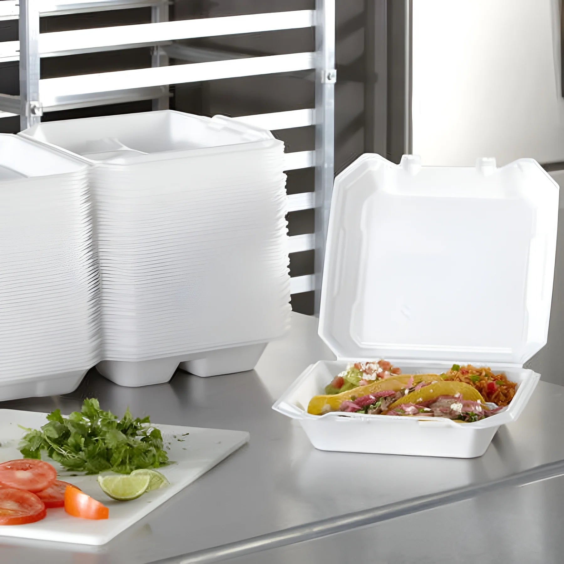 The MM 3-Compartment Foam Hinged Lid Container by Hefty is a 125-count pack of durable foam carryout containers ideal for catering, parties, and concessions. Each container features three compartments with a hinged lid , a soak-proof layer , and dual-tab closures to prevent leakage . The containers are easy to open and close, and their sturdy design allows for stacking, saving space on counters and in bags. This bulk pack is an economical choice for households and businesses, and the containers can be stored in a pantry or cabinet until needed.